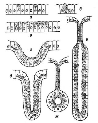 Рис. 1. Развитие желёз (схема): а — железистые клетки в эпителиальном пласте; б — одноклеточная слизистая железа (бокаловидная клетка); в — железистое поле; г — железистая ямка; д — железистая трубка, обособляющаяся от эпителиального пласта; е — формирование железы (дифференцировка аденомера) трубчатой формы и выводного протока; ж — формирование альвеолярной железы.
