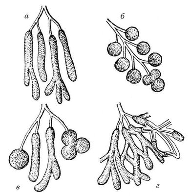 Рис. 3. Виды сложных желёз (схема): а — трубчатая; б — альвеолярная; в — трубчато-альвеолярная; г — сетчатая.