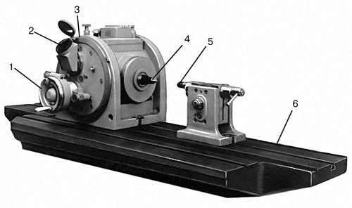 Рис. 4. Делительная головка: 1 — блок настройки; 2 — оптический окуляр; 3 — шкала; 4 и 5 — центры для установки детали; 6 — стол.