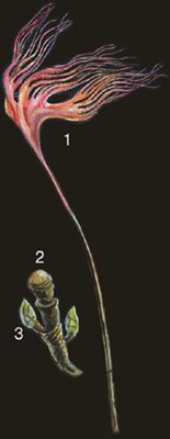 Глубоководные животные: 1 — морское перо Umbellula tomsoni; 2 — актиния Galatheanthemum profundale и 3 — усоногие рачки Scalpellum на ней.