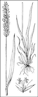 Душистый колосок пахучий: верхняя (слева) и нижняя (справа) части растения; а — колосок.