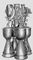 Рис. 1. Кислородо-керосиновый 4-камерный жидкостный ракетный двигатель РД-107 с тягой 1 Мн (102 тс) первой ступени ракеты-носителя «Восток» (ГДЛ-ОКБ, 1954-57): 1 — рулевые камеры сгорания; 2 — основные камеры сгорания; 3 — силовая рама; 4 — газогенератор; 5 — теплообменник на турбине; 6 — насос окислителя; 7 — насос горючего.