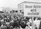 Митинг бастующих у ворот предприятия «Мерседесверке» в Мангейме во время забастовок металлистов. ФРГ. 1971.