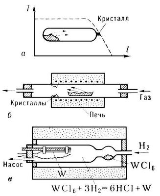 Рис. 7. Схема установки для кристаллизации из газовой фазы; пунктиром показано распределение температуры вдоль печи.