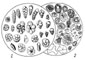 Кальцитовые скелеты микроорганизмов, слагающих мел: 1 — фораминиферы (зарисовки под световым микроскопом); 2 — кокколиты и их обломки (зарисовки с электронно-микроскопических фотоснимков).