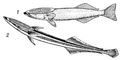 Прилипалы: 1 — акулья ремора; 2 — обыкновенный прилипало.