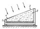 Схема солнечного опреснителя типа «горячий ящик»: 1 — сосуд с солёной водой; 2 — паровоздушная смесь; 3 — прозрачная крышка; 4 — конденсат; 5 — теплоизолирующая стенка ящика; стрелками обозначены солнечные лучи.