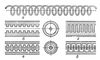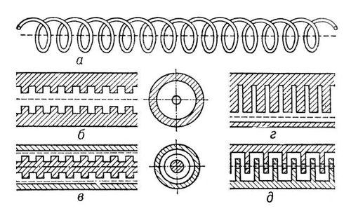 Замедляющие системы: а — спиральная; б и в — ёмкостные; г — гребенчатая; д — встречно-стержневая. Пунктиром показан электронный поток.