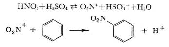 Кинетика процесса в первом случае отвечает первому, во втором — второму порядку (см. Кинетика химическая). Электрофильное замещение наиболее характерно для ароматических соединений, например: