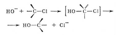 Для первичных и вторичных алкилгалогенидов более характерен одностадийный гидролиз, при котором разрыв связи С — галоген и образование связи С—ОН происходит синхронно (нуклеофильное бимолекулярное замещение, SN2):