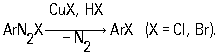 Зандмейера реакция, метод введения атома галогена в ароматическое ядро путём разложения соли диазония в присутствии галогенидов одновалентной меди. Реакцию обычно осуществляют нагреванием реагентов в избытке галогеноводородной кислоты: