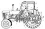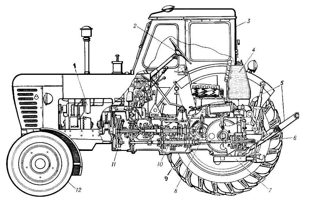 Рис. 1. Продольный разрез колесного трактора: 1 — двигатель; 2 — рулевое колесо; 3 — кабина; 4 — топливный бак; 5 — рычаги навесного устройства; 6 — вал отбора мощности; 7 — прицепной крюк; 8 — центральная передача; 9 — ведущее колесо; 10 — коробка передач; 11 — муфта сцепления; 12 — направляющее колесо.