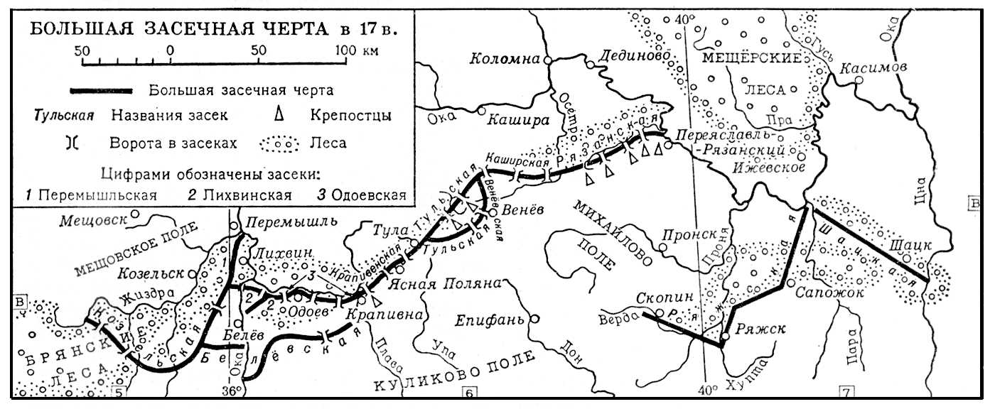 Лит.: Яковлев А., Засечная черта Московского государства в XVII в., М., 1916; Новосельский А. А., Борьба Московского государства с татарами в 1-й половине XVII в., М. — Л., 1948; Разин Е. А., История военного искусства, т. 3, М., 196l; Загоровский В. П., Белгородская черта, Воронеж, 1969.