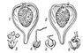 Капрификация: 1 — продольный разрез соцветия инжира с тычиночными цветками (около отверстия) и женскими короткопестичными цветками, в завязь которых весной проникают и откладывают яйца осы бластофаги; развивающиеся из яиц личинки питаются содержимым семяпочек (превращающихся в галлы) и развиваются во взрослых насекомых, которые здесь же спариваются; оплодотворённая самка, вылетая из соцветия, покрывается пыльцой с тычиночных цветков; 2 — продольный разрез соцветия с женскими длиннопестичными цветками, в которое вползает оса в поисках короткопестичных цветков, чтобы отложить в них яйца (в длиннопестичные цветки она отложить яйца не может, так как у неё короткий яйцеклад), и опыляет их; из опылённых цветков развиваются нормальные плодики, а мясистое цветоложе разрастается, образуя винную ягоду инжира; 3 — тычиночный цветок; 4 — женский длиннопестичный цветок; 5 — женский короткопестичный цветок; 6 — оса, выходящая из завязи.