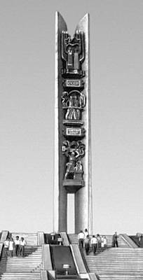 Скульптор А. Н. Бурганов, архитектор Р. К. Топуридзе, инженер Е. Г. Бисноватый. Монумент «Навеки с Россией». Железобетон, сталь, кованая медь, позолота. Ижевск. 1972.