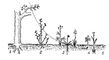 Рис. 1. Жизненные формы: 1 — фанерофиты (тополь, омела); 2 — хамефиты (черника); 3 — гемикриптофиты (лютик, одуванчик, щучка); 4 — геофиты (ветреница, тюльпан); 5 — семя терофитов (фасоль). Почки увеличены, обозначены чёрным, соединены пунктирной линией.