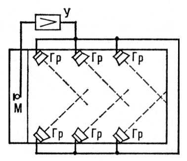 Рис. 2. Схема зональной системы звукоусиления: М — микрофон; У — усилитель электрических колебаний звуковых частот; Гр — громкоговоритель.