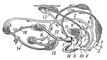 Рис. 1. Схема кровеносной системы лягушки: I — венозная пазуха; II — правое предсердие; III — левое предсердие; IV — желудочек; V — артериальный ствол; 1 — лёгочно-кожная артерия; 2 — дуга аорты; 3 — сонная артерия; 4 — язычная артерия; 5 — сонная железа; 6 — подключичная артерия; 7 — общая аорта; 8 — кишечная артерия; 9 — кожная артерия; 10 — лёгочная вена; 11 — лёгкое; 12 — задняя полая вена; 13 — кожная вена; 14 — брюшная вена; 15 — печень; 16 — почечная вена.