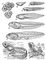 Земноводные. 1 — чесночница (Pelobates fuscus); 2 — рогатка (Ceratophrys cornuta); 3 — изменчивый ателоп (Atelopus varius); 4 — венесуэльский короткоголов (Atelopus cruciger); 5 — южноафриканский узкорот (Breviceps adspersus); 6 — американская лягушка (Rana pipiens); 7 — остромордая лягушка (Rana terrestris), самец в брачном наряде, 8 — он же в обычном наряде; 9 — зелёная лягушка (Rana esculenta).