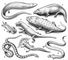 Земноводные. 1 — кольчатая червяга (Siphonops annulatus); 2 — протей (Proteus anguinus); 3 — красный ложный тритон (Pseudotriton ruber): 4 — огненная саламандра (Salamandra salamandra); 5 — обыкновенный тритон (Triturus vulgaris), самка, 6 — самец; 7 — малоазиатский тритон (Triturus vittatus), самка, 8 — самец; 9 — аксолотль — личинка амбистомы (Ambistoma tigrinum); 10 — дальневосточная жерлянка (Bombina orientalis); 11 — квакша (Hyla arborea).