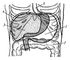 Рис. 5. Схема расположения желудка человека в брюшной полости (заштрихованы части, прикрытые впередилежащими органами): 1 — желудок; 2 — поперечная ободочная кишка; 3 — печень; 4 — диафрагма; 5 — пищевод.