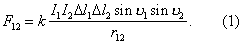 Сила F12 , действующая со стороны первого отрезка проводника Dl1 на второй Dl2 (рис. 1), равна: