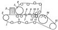 Рис. 3. Схема сеточной части бумагоделательной машины типа инверформ: 1 — нижняя сетка; 2 — грудной вал; 3 — напорный ящик; 4 — регистровый валик; 5 — формующий цилиндр; 6 — верхняя сетка; 7 — отсасывающий ящик; 8 — шаберное устройство верхней сетки; 9 — «перевёрнутые» отсасывающие ящики; 10 — отсасывающий шабер; 11 — верхний вал предварительного пресса; 12 — отсасывающий ящик; 13 — нижний вал предварительного пресса; 14 — отсасывающий гауч-вал; 15 — сетковедущий вал, расположенный за гауч-валом.