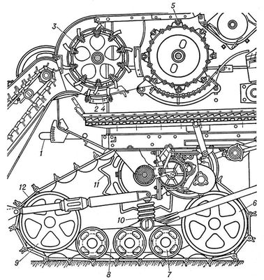 Рис. 3. Молотильное устройство и гусеничный движитель комбайна для уборки риса на переувлажнённых почвах: 1 — рычаг для регулирования зубовой рамки; 2 — зубовая рамка; 3 — штифтовый барабан; 4 — решётка; 5 — бильный барабан; 6 и 9 — направляющие колёса; 7 — каток; 8 — балансирная тележка; 10 — амортизатор; 11 — ведущая звёздочка; 12 — гусеничная лента.