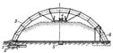 Рис. 2. Напольное зернохранилище из сборного железобетона со сводчатой кровлей: 1 — железобетонный фундамент; 2 — песчаная подушка; 3 — ребристая плита; 4 — транспортёр в верхней галерее; 5 — транспортёр в нижней галерее; 6 — ворота (пунктиром отмечена ёмкость, загружаемая зерном).