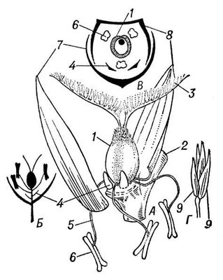 Рис. 4. Цветок злака: А — частично отпрепарированный; Б и В — продольная и поперечная диаграммы; Г — колосок; 1 — завязь, 2 — ось колоска, 3 — рыльце, 4 — лодикулы, 5 — тычиночная нить, 6 — пыльник, 7 — лемма, 8 — верхняя цветковая чешуя, 9 — бесплодные (колосковые) чешуи, нижняя и верхняя.
