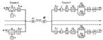 Схема тонального телеграфирования с частотной модуляцией и частотным делением спектра телефонного канала: ИИ — источники информации; М — модуляторы; Г — генераторы; Фпер — фильтры передачи; ЛТ — линейные трансформаторы; Фпр — фильтры приёма; У — усилители; ОА — ограничители амплитуды; ЧД — частотные детекторы; АД — амплитудные детекторы; СС — схемы сравнения; ЭР — электронные реле; ПИ — приёмники информации; f — несущие частоты М; f1 и f2 — характеристические частоты ЧД.