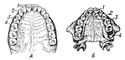 Рис. 2. Зубы человека (верхняя челюсть). А — постоянные зубы: 1 — резцы; 2 — клыки; 3 — премоляры; 4 — моляры; Б — молочные зубы: 1 — резцы; 2 — клыки; 3 — коренные; 4 — закладка постоянных зубов. Расположение и названия для нижней челюсти — те же.