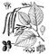 Рис. 2. Ольха серая, ветка с тычиночными (♂) и пестичными (♀) соцветиями; а — пестичный дихазий; б — тычиночный дихазий; в — чешуйка; г — плод; д — соплодия.