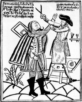 Лубочная картинка «Цирюльник хочет раскольнику бороду стричь». Гравюра на дереве. 1-я четверть 18 в. Музей изобразительных искусств им. А. С. Пушкина. Москва.