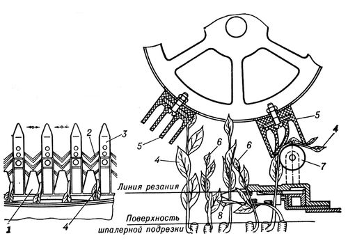 Технологическая схема работы чаесборочной машины ЧА-650/900: 1 — режущая дуга; 2 — капроновые нити; 3 — пальцы; 4 — побеги, подлежащие срезу; 5 — лопасти мотовила; 6, 8 — недозрелые побеги; 7 — отборочные валики.