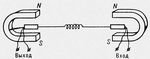 Рис. 2. Схема пружинной линии задержки: 1 — постоянный магнит; 2 — упруго закрепленная рамка из изолированного провода; 3 — пружина; 4 — свободно поворачивающаяся рамка из изолированного провода.