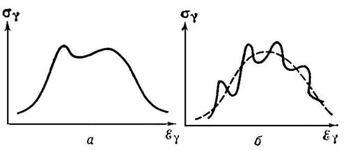 Рис. 2. Тонкая структура гигантского резонанса: а — для деформированных ядер, б — для сферических ядер.