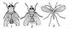 Двукрылые насекомые: 1 — бычий слепень; 2 — паразитическая муха — тахина; 3 — гессенская муха.