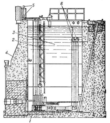Рис. 1. Продольный разрез реактора Института атомной энергии имени И. В. Курчатова: 1 — активная зона; 2 — загрузочное устройство; 3 — вода-теплоноситель; 4 — радиационная защита; 5 — приводы системы дистанционного управления; 6 — напорный и всасывающий трубопроводы.