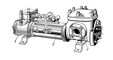 Рис. 2. Паровой прямодействующий поршневой двухцилиндровый насосный агрегат системы Вортингтона в современном исполнении: 1 — блок с цилиндрами и клапанами поршневого насоса; 2 — шток, соединяющий поршни насоса и парового двигателя; 3 — блок с цилиндрами и золотниками паровой машины.