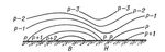 Вертикальный разрез изобарических поверхностей над циклоном (Н) и антициклоном (В). Поверхности проведены через равные интервалы давления p.