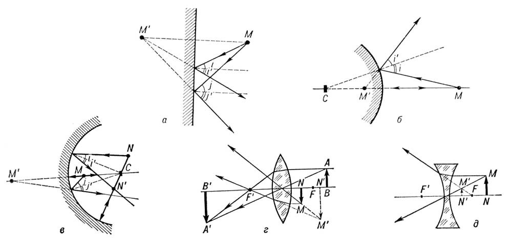 Образование оптических изображений: а — мнимого изображения M' точки М в плоском зеркале; б — мнимого изображения M' точки М в выпуклом сферическом зеркале; в — мнимого изображения M' точки М и действительного изображения N' точки N в вогнутом сферическом зеркале; г — действительного A' B' и мнимого M'N' изображений предметов AB и MN в собирающей линзе; д — мнимого изображения M'N' предмета MN в рассеивающей линзе: i, j — углы падения лучей; i', j' — углы отражения: С—центры сфер; F, F' — фокусы линз.