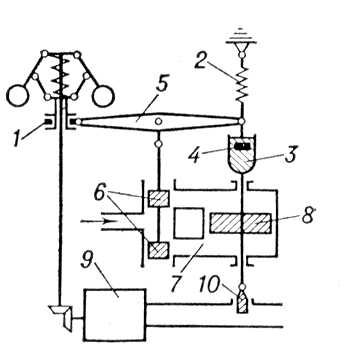 Схема изодромного регулятора оборотов: 1 — муфта центробежного регулятора; 2 — пружина изодрома; 3 — цилиндр; 4 — поршень; 5 — рычаг; 6 — золотник; 7 — сервомотор; 8 — поршень сервомотора; 9 — двигатель; 10 — заслонка.