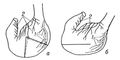 Разрезы (указаны линиями) для образования изолированных желудочков по Гейденгайну (а) и по Павлову (6); 1 и 2 — желудочные сплетения блуждающего нерва.