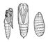 Типы куколок: слева — открытая, или свободная (наездника); в центре — покрытая (бабочки); справа — скрытая (мухи).