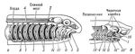 Рис. 2. Схема строения висцерального скелета у челюстноротых: а — висцеральный скелет гипотетического предка челюстноротых: 1 — жаберная щель; 2 — жаберный лепесток; 3 — жаберная перегородка; 4 — расчленённая жаберная дуга; 5 — ротовое отверстие; I, II, III, IV,..., Х — жаберные дуги; б — висцеральный скелет акулы: I, II — губные хрящи; III — первичная верхняя челюсть (нёбноквадратный хрящ); III'— первичная нижняя челюсть (меккелев хрящ); IV — подвесок; IV' — гиоид; V — IX — жаберные дуги.