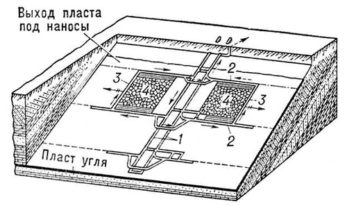 Рис. 3. Вскрытие пласта наклонными стволами: 1 — наклонные стволы; 2 — штреки; 3 — очистные забои; 4 — обрушенные породы.