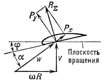 Рис. 3. Схема векторов аэродинамических сил и скоростей в сечении лопасти.