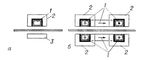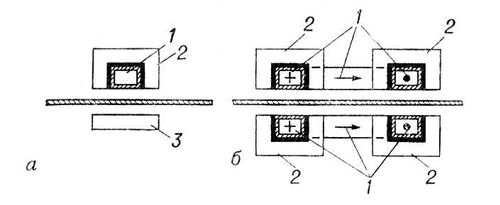 Рис. 4. Схема индукторов для нагрева листового материала в поперечном магнитном поле при размещении индуктирующего провода: а — с одной стороны нагреваемого листа; б — с обеих сторон нагреваемого листа; 1 — индуктирующий провод; 2 — магнитопровод; 3 — ярмо магнитопровода.
