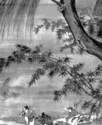 Неизвестный художник. «Пейзаж с танцующими фигурами» (фрагмент). Шёлк, тушь. 10—13 вв. Пекинский дворец-музей.